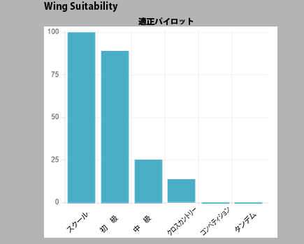 KARISMA IIは非常に軽い立ち上げ特性を持ち、飛行安定性も優れた特性を持っていますので、スクール1機目としてのチョイスが最適です。軽快なハンドリング特性と浮きの良さでスクールを卒業してからも末永くお使いいただけるグライダーとなっております。より安全に軽快なフライトを希望するベテランパイロットにもおすすめのグライダーです。右の表は、Karisma2をお勧めするパイロットスキルのチャートです。 |